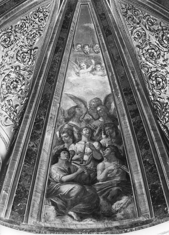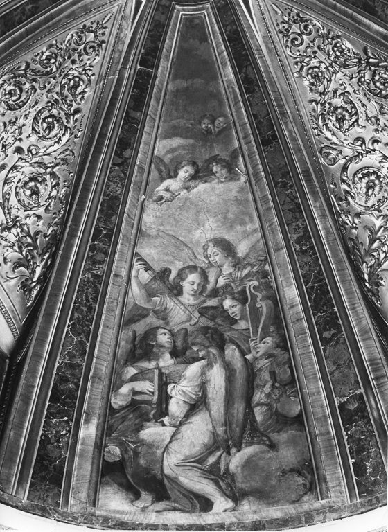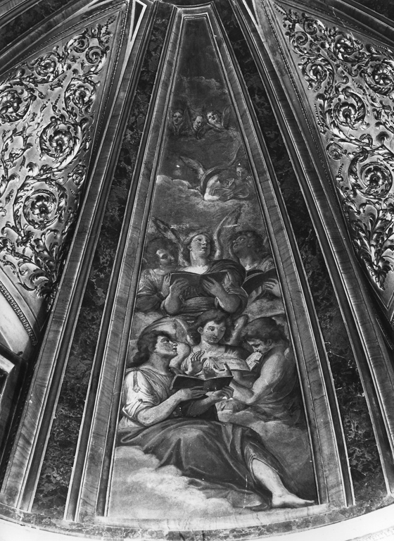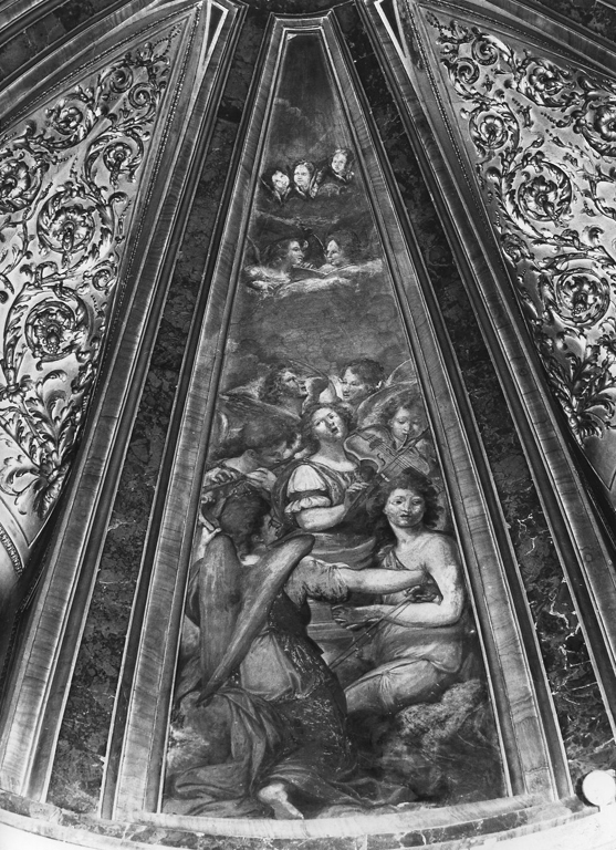 La volta è articolata in otto spicchi che si irradiano dalla colomba dello Spirito Santo dipinta al centro della cupola. Ad ogni spazio decorato ad affresco si alterna uno in stucco con motivi a girali d'acanto