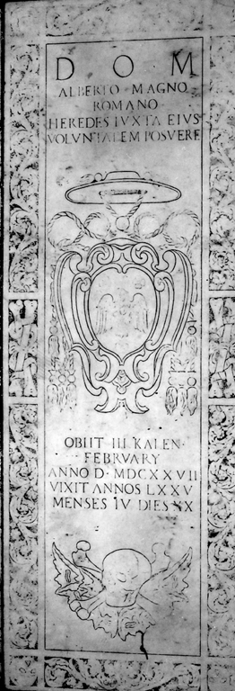 - ISCRIZIONI campo centrale, in alto e al centro verso il basso - D O M / ALBERTO MAGNO / ROMANO / HEREDES IVXTA EIVS / VOLVNTATEM POSVERE / (stemma) / OBIIT III KALEN. / FEBRVARY / ANNO D. MDCXXVII / VIXIT ANNOS LXXV / MENSES IV DIES XX - lettere capitali -