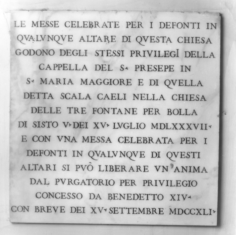 - ISCRIZIONI al centro - LE MESSE CELEBRATE PER I DEFONTI IN/ QUALUNQUE ALTARE DI QUESTA CHIESA/ GODONO DEGLI STESSI PRIVILEGI DELLA/ CAPPELLA DEL S.PRESEPE IN/ S.MARIA MAGGIORE E DI QUELLA/ DETTA SCALA CAELI NELLA CHIESA/ DELLE TRE FONTANE PER BOLLA/ DI SISTO V DEI XV LUGLIO MDLXXXVII/ E CON UNA MESSA CELEBRATA PER I/ DEFONTI IN QUALUNQUE DI QUESTI/ ALTARI SI PUO' LIBERARE UN ANIMA/ DAL PURGATORIO PER PRIVILEGIO/ CONCESSO DA BENEDETTO XIV/ CON BREVE DEI XV SETTEMBRE MDCCXLI - lettere capitali -