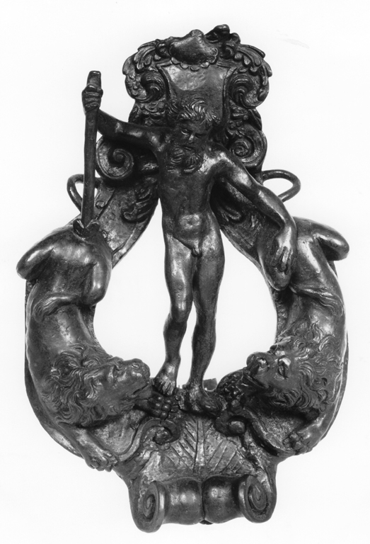 formato dalla figura centrale di Nettuno, in piedi su una grande voluta, fiancheggiato da due leoni discendenti; tiene nella mano sinistra una lancia capovolta. Alle sue spalle una cartella con motivi di foglie e volute, a sbalzo; sul retro del picchiotto sono presenti due staffe per agganciarlo al portone