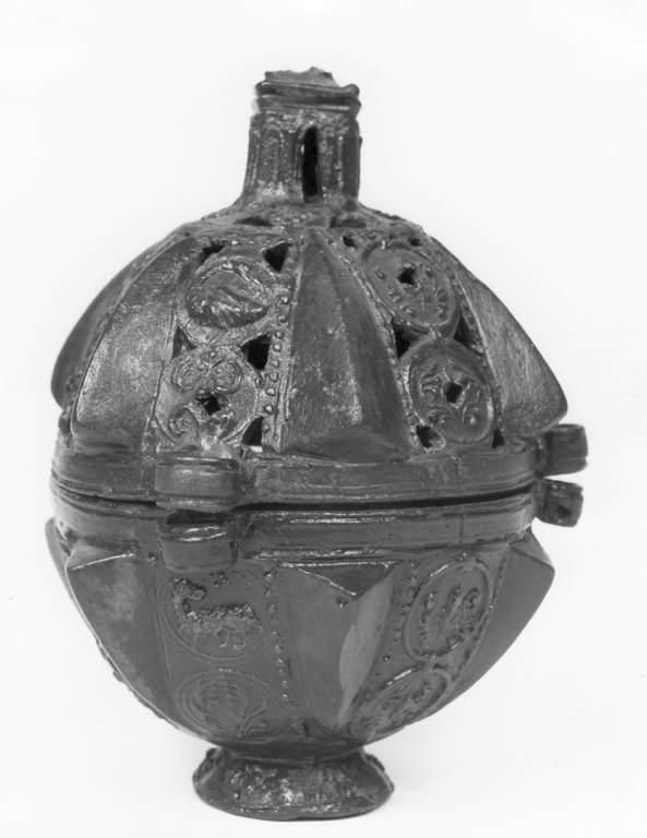 turibolo con coppa semisferica sfaccettata su piede a base circolare, e coperchio sfaccettato traforato. E' ornato con elementi circolari con all'interno motivi fitomorfi ed animali e trafori sul coperchio