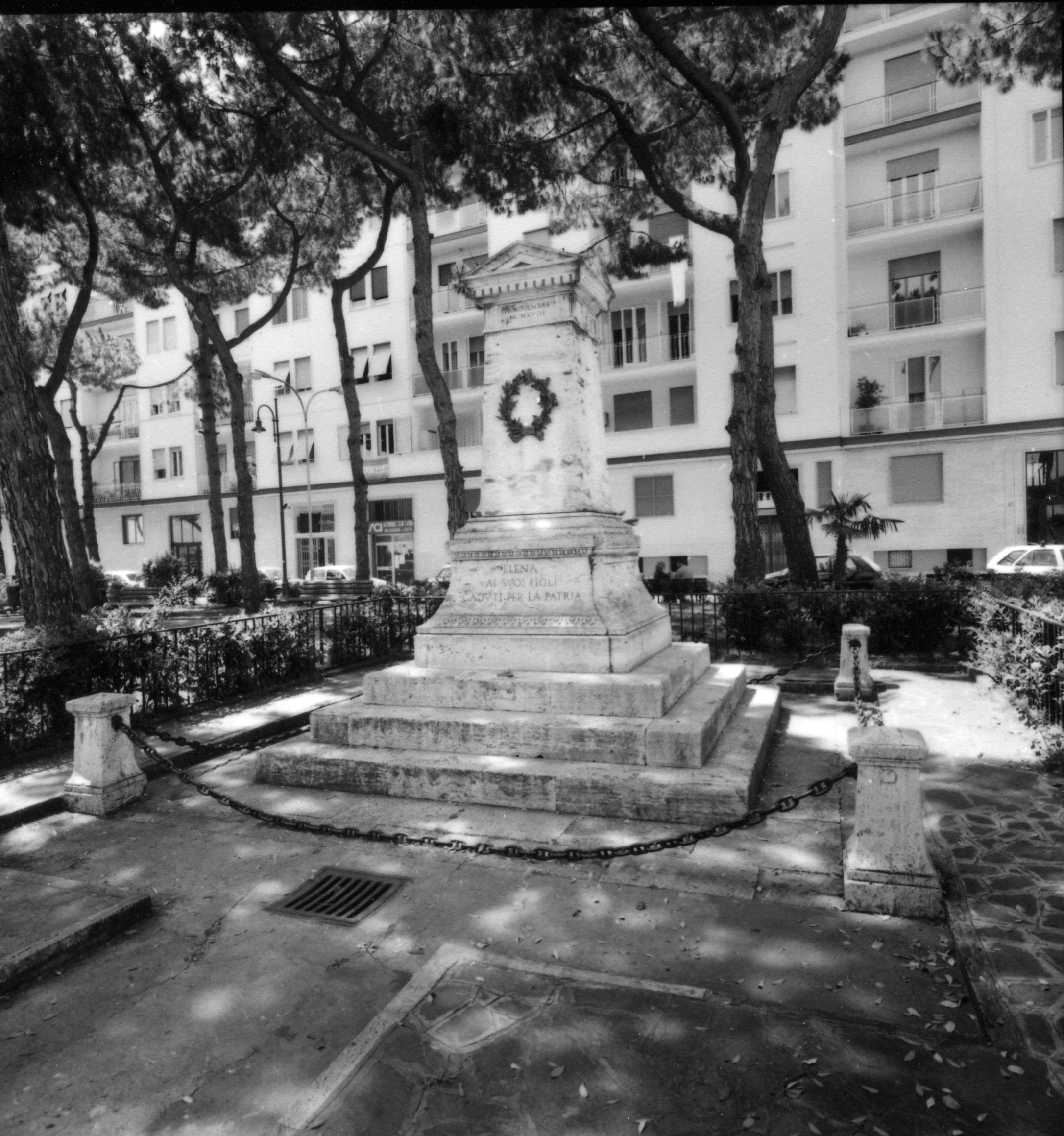 - NOTIZIE STORICO CRITICHE Monumento dedicato ai caduti della guerra del 1915-18 dalla regina Elena, moglie di Vittorio Emanuele III. Di forma semplice e lineare, si esempla su modelli dell'arte classica. Già dalla fine del sec. XIX si riafferma l'antica regola convenzionale per cui i superstiti di una guerra mondiale avevano il sacro dovere di onorare e ricordare con monumenti i patrioti caduti per la causa comune sul campo di battaglia. Attorno al monumento si rivive l'eredità storica comune, rinnovando e rafforzando quel senso di fratellanza patriottica che da ciò scaturiva. Nel corso degli anni Venti del Novecento si assiste alla prolificazione nelle piazze dei piccoli comuni di monumenti celebrativi in cui è facile ritrovare riferimenti con la tradizione romana (trofei, archi, colonne) Le tipologie più ricorrenti sono le steli decorate, i monumenti a figura singola o di gruppi plastici più complessi