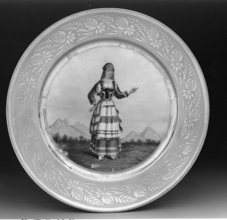 piatto circolare con tesa dorata integralmente decorata a motivo vegetale; al centro, raffigurazione di donna in costume popolare in un paesaggio