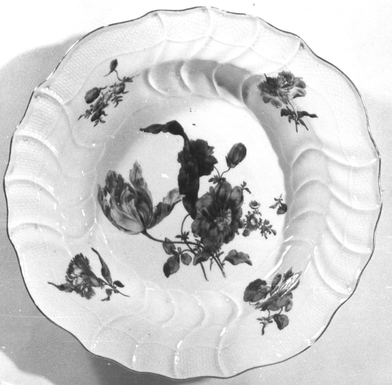Piatto fondo circolare con bordo sagomato e filettato d'oro. La tesa presenta una fascia a rilievo simulante un intreccio ed è percorsa da nervature ondulate che convergono verso il centro. Sul fondo bianco sono dipinti fiori e mazzi di fiori policromi con tulipano giallo e rosso, anemone blu e altri fiori blu.