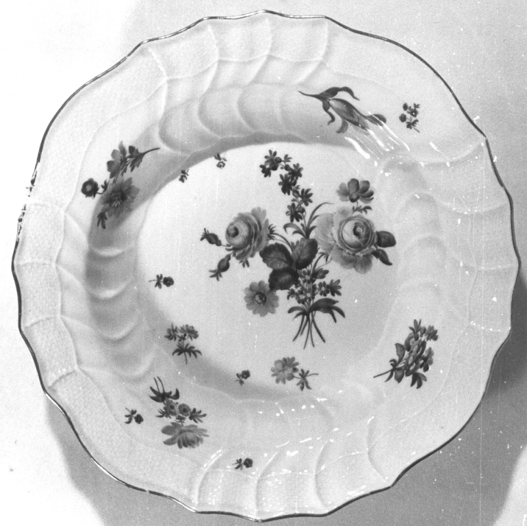 Piatto fondo circolare con bordo sagomato e filettato d'oro. La tesa presenta una fascia a rilievo simulante un intreccio ed è percorsa da nervature ondulate che convergono verso il centro. Sul fondo bianco sono dipinti fiori e mazzi di fiori policromi con rose gialle e rosa, e altri fiori blu, rosa e arancio