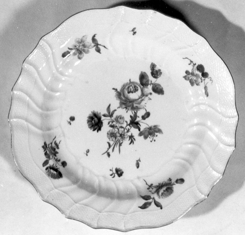 Piatto fondo circolare con bordo sagomato e filettato d'oro. La tesa presenta una fascia a rilievo simulante un intreccio ed è percorsa da nervature ondulate che convergono verso il centro. Sul fondo bianco sono dipinti fiori e mazzi di fiori policromi con una rosa e fiori gialli, arancioni e azzurri