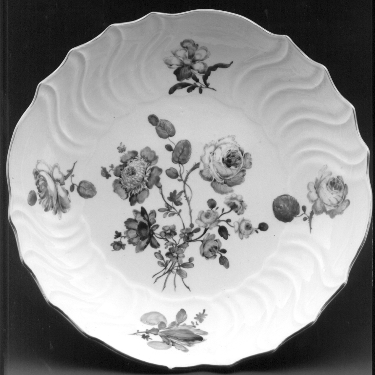 Grande piatto circolare con alto bordo sagomato e filettato d'oro. La tesa presenta una fascia a rilievo che simula un intreccio ed è percorsa da nervature ondulate che convergono verso il centro. Sul fondo bianco sono dipinti fiori e mazzi di fiori policromi con rose gialle, e fiori viola e azzurri