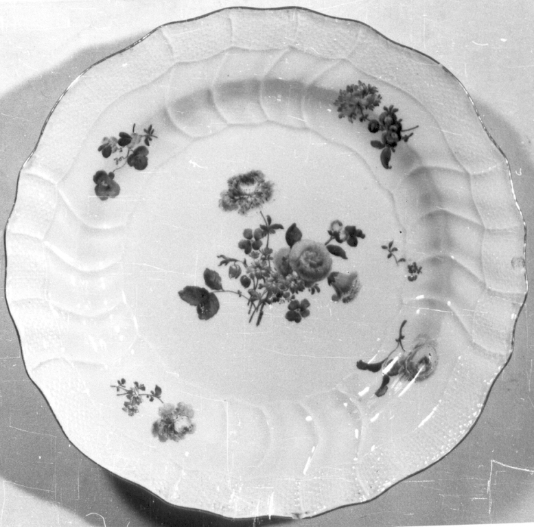 Piatto fondo circolare con bordo sagomato e filettato d'oro. La tesa presenta una fascia a rilievo simulante un intreccio ed è percorsa da nervature ondulate che convergono verso il centro. Sul fondo bianco sono dipinti fiori e mazzi di fiori policromi (gialli, azzurri e rosa).