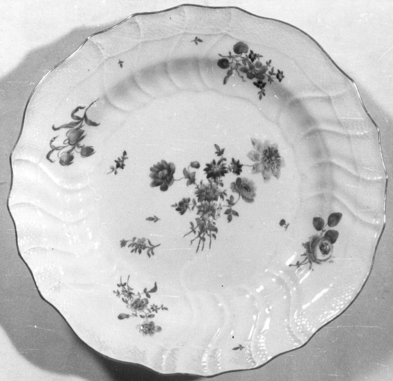 Piatto fondo circolare con bordo sagomato e filettato d'oro. La tesa presenta una fascia a rilievo simulante un intreccio ed è percorsa da nervature ondulate che convergono verso il centro. Sul fondo bianco sono dipinti fiori e mazzi di fiori policromi con una cineraria, un papavero e fiori gialli, azzurri e viola.