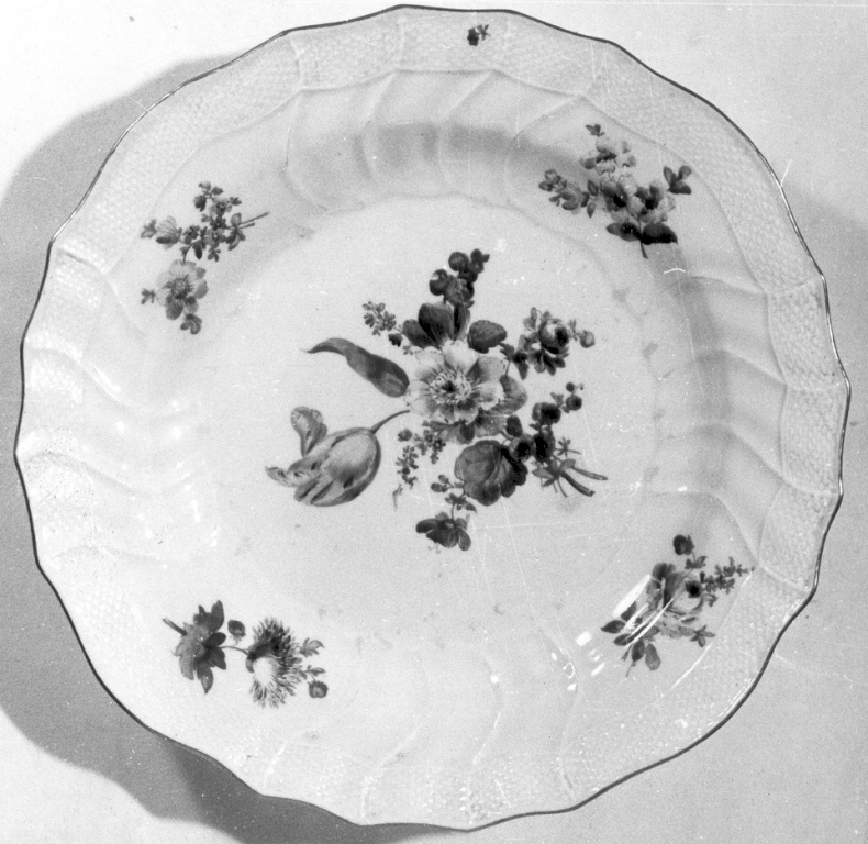 Piatto fondo circolare con bordo sagomato e filettato d'oro. La tesa presenta una fascia a rilievo simulante un intreccio ed è percorsa da nervature ondulate che convergono verso il centro. Sul fondo bianco sono dipinti fiori e mazzi di fiori policromi tra cui un tulipano giallo, rose, ranuncoli