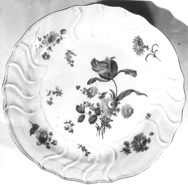 Grande piatto circolare con orlo ondulato profilato in oro. La tesa è percorsa da nervature ondulate e da una fascia a rilievo simulante un fitto intreccio di vimini. Sul fondo bianco sono mazzi dii fiori policromi tra cui un tulipano giallo e viola, rosa viola e non ti scordar di me