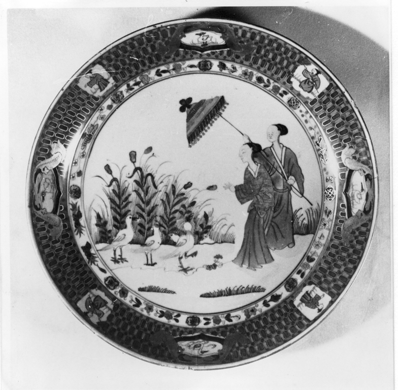 ciotola circolare decorata all'interno da una fascia lungo l'orlo a motivo geometrico in arancio e oro con riseve a fondo bianco su cui sono raffigurati personaggi in costume orientale e uccelli acquatici. Al centro incorniciata da un motivo floreale in blu, arancio e oro, la raffigurazione di una donna in costume orientale accompagnata da un'ancella che regge un parasole in un paesaggio lacustre