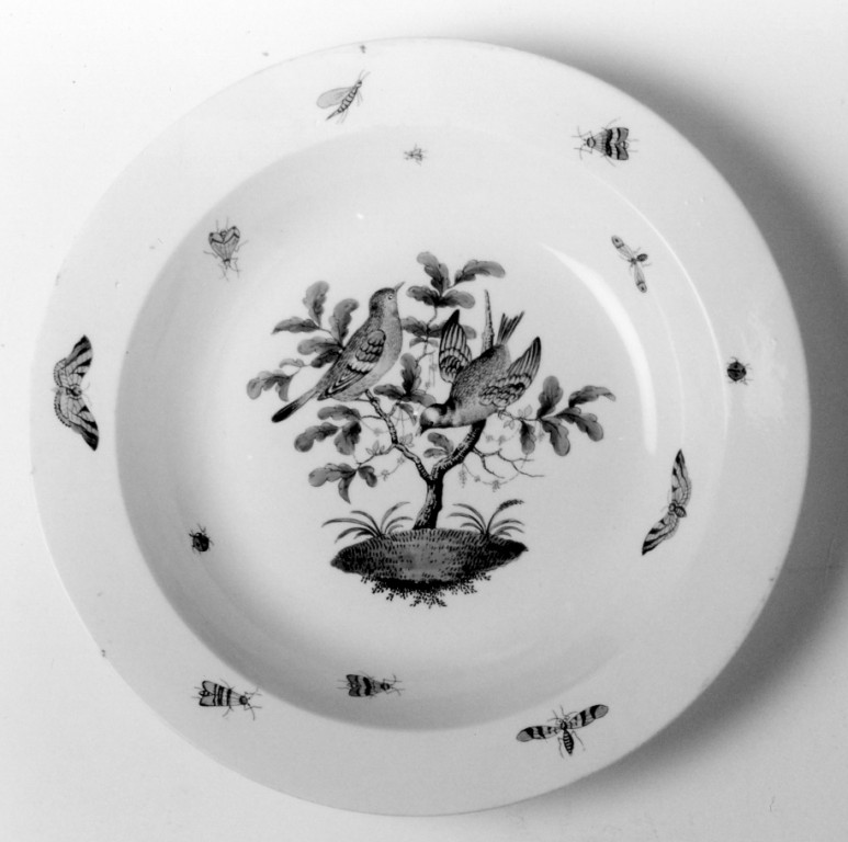 piatto fondo circolare con tesa piatta e decorazione a farfalle e insetti sparsi e al centro un albero con uccelli posati sui rami, su fondo bianco