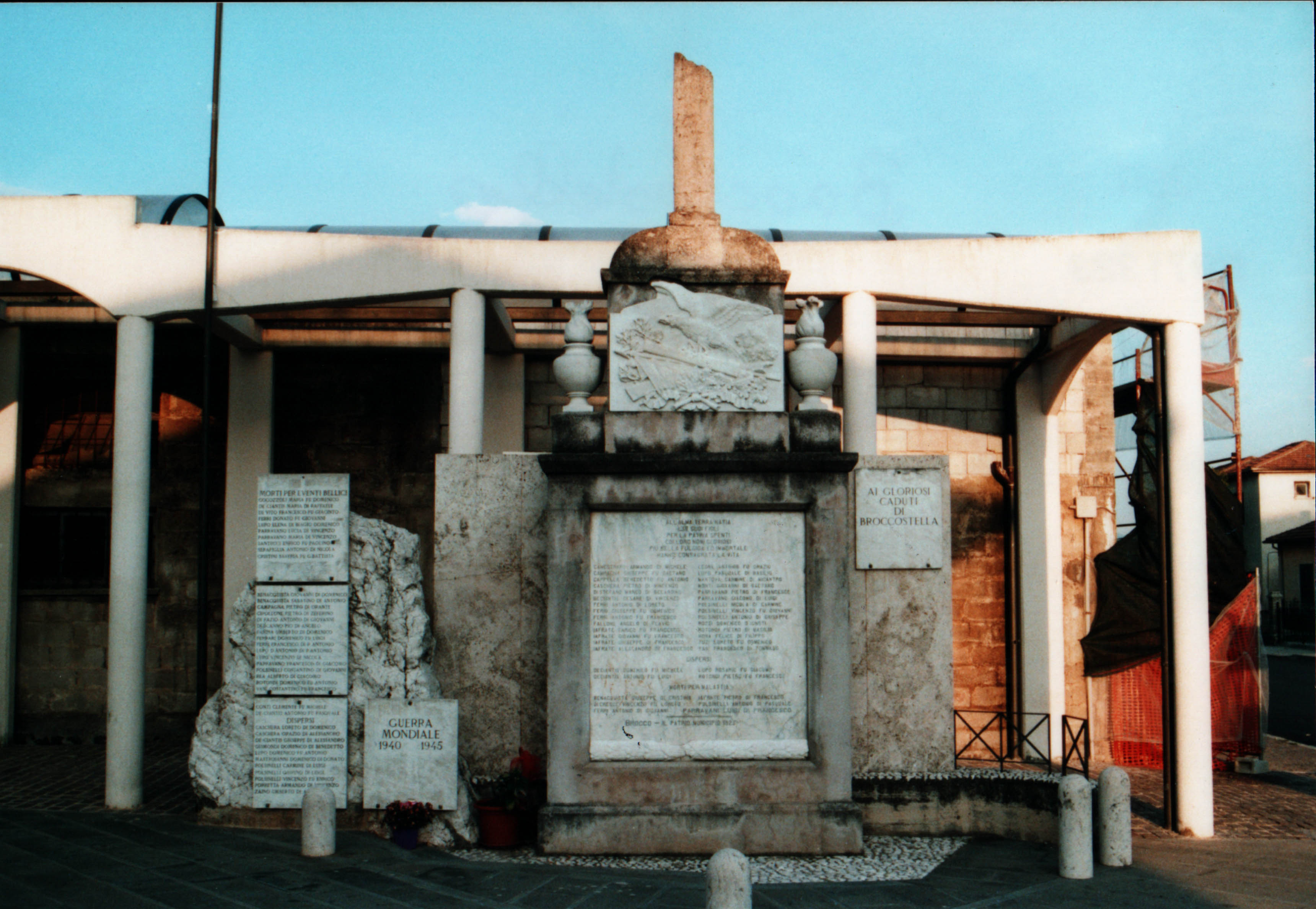 - ISCRIZIONI lapide corpo centrale - ALL'ALMA TERRA NATIA/ I 38 SUOI FIGLI/ PER LA PATRIA SPENTI/ COI LORO NOMI GLORIOSI/ PIÙ BELLA FULGIDA ED IMMORTALE/ HANNO CONSAGRATA LA VITA/ [...]// DISPERSI/ [...]// MORTI PER MALATTIA/[...]/ BROCCO - IL PATRIO MUNICIPIO 1923 - maiuscolo -