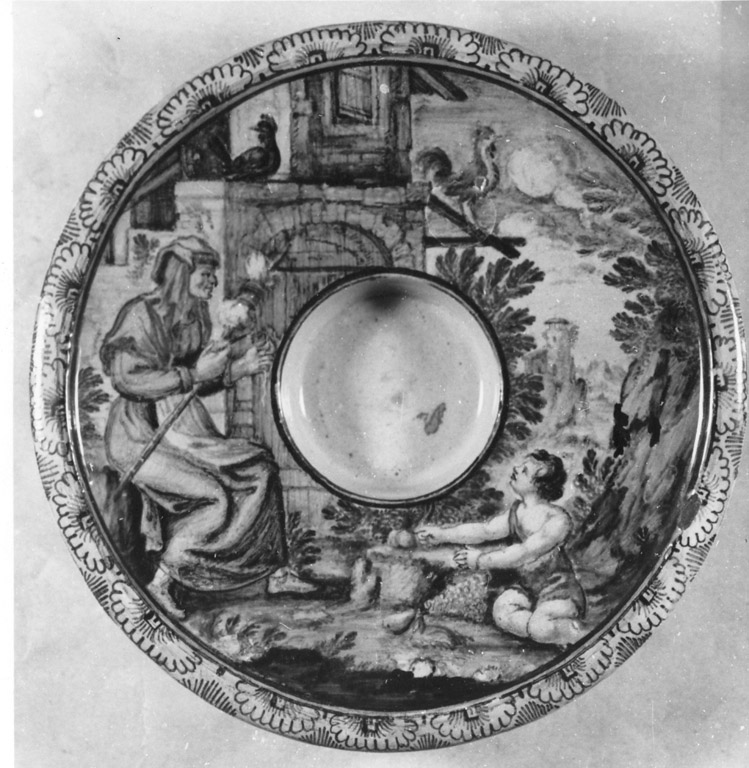 Portachicchera media con cavetto cilindrico, bordo robusto. Decorata in zallo, ferraccia, ramina, cobalto, manganese
