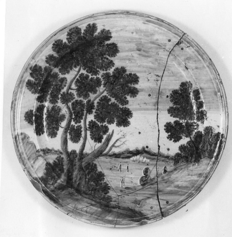 Piatto medio a tesa breve. Decorato con paesaggio composto da un grande albero quasi al centro, un altro a destra e montagne sul fondo