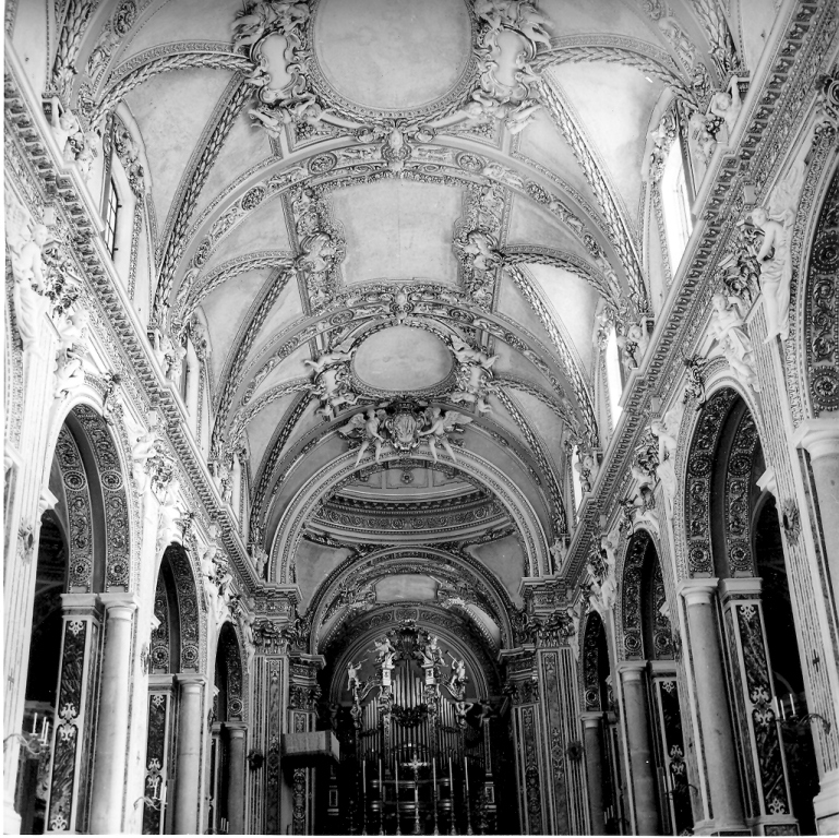 - NOTIZIE STORICO CRITICHE L'attuale volta è stata interamente ricostruita e integrata con frammenti originali tra il 1945 e il 1964. Per la decorazione originaria resta il contratto stipulato nel 1649 fra Domenico Quesada (Abate di Montecassino dal 1649 al 1653) e Cosimo Fanzago, la cui prima visita all'Abbazia risale al 1627. Nella volta, prima della distruzione del 1944, si trovavano gli affreschi di Luca Giordano che avevano come tema i miracoli di San Benedetto (1677) e delle rappresentazioni allegoriche