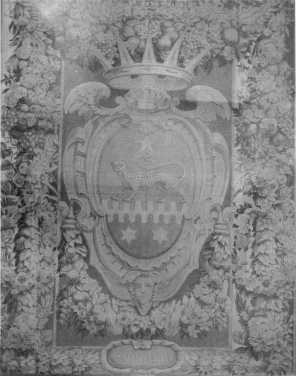 Araldica: stemma della Somalia. Decorazioni: corona; serti floreali; cartiglio