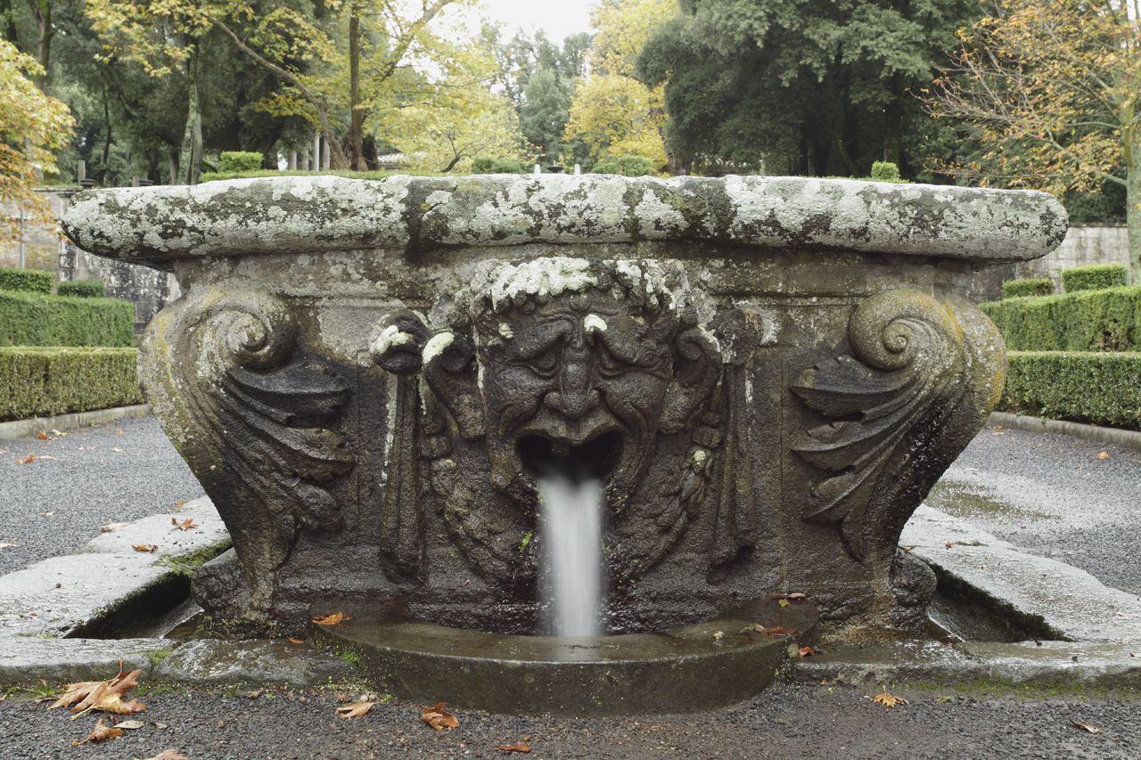 volto caricaturale di figura maschile cinto inferiormente da ghirlanda e con bocca aperta adattata al getto d'acqua