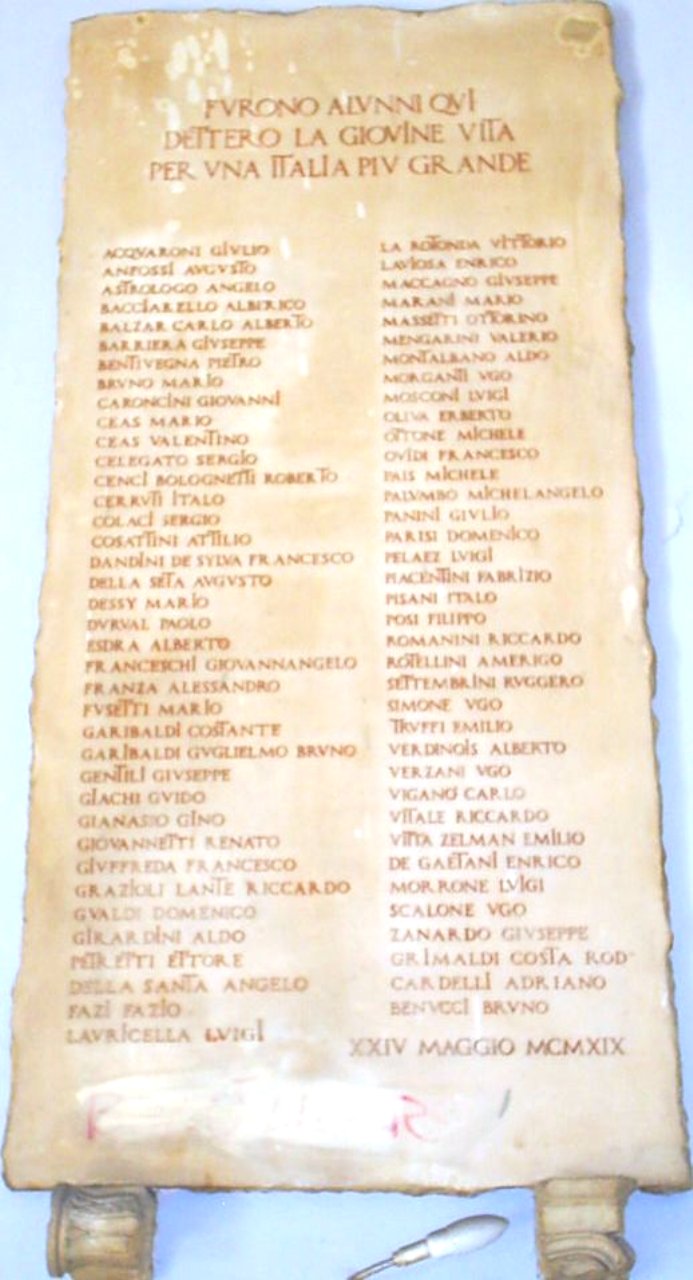 - NOTIZIE STORICO CRITICHE La lapide fu inaugurata il 24 maggio 1919. Nell'aula magna dell'Istituto sono collocate altre due lapidi dove è inciso il proclama del re e il bollettino della vittoria; sul ballatoio del primo piano un'altra lapide in bronzo con il bollettino della vittoria. Cfr. "La Memoria perduta, I monumenti ai caduti della Grande Guerra a Roma e nel Lazio", a cura di Vittorio Vidotto, Bruno Tobia, Catherina Brice- Argos 1998, p. 96
