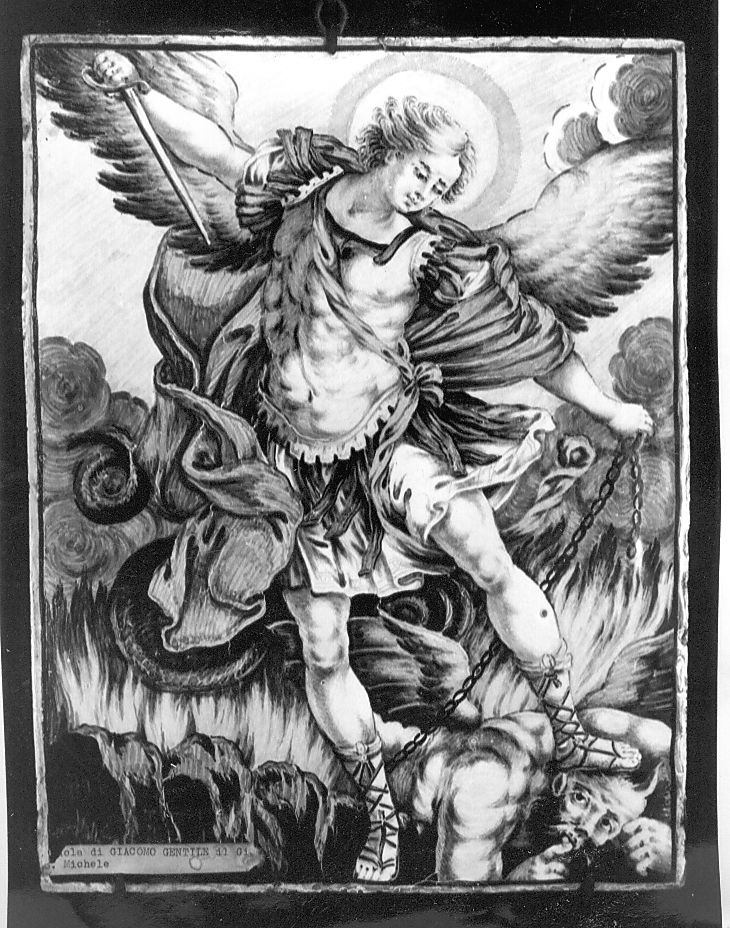 Mattonella policroma con l'immagine di S. Michele Arcangelo ( da Guido Reni). Non è firmata ma la critica l'ha attribuita a Giacomo Gentili, il giovane, facilmente riconoscibile per il suo manierismo. Colorazione sobria nella tradizionale tavolozza castellana, con spiccati gialli ed arancetti. Non è da escludere una paternità di Carmine Gentili
