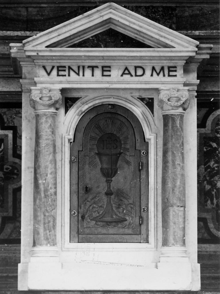 - NOTIZIE STORICO CRITICHE Da M. Morelli (1977, p. 52) si apprende che intorno al 1640 i nobili fratelli Colantonj affidarono all'architetto Ercole Ferrata il disegno della cappella dedicata all'Assunta di loro proprietà, sita in S. Maria di Roio dove oggi è ubicata la sala attigua alla sagrestia, che il Ferrata si trovasse ad operare all'Aquila in questo periodo è attestato anche da L. Serra (1929, p. 127) il quale dà notizia dell'attività dell'architetto nell'oratorio di S. Antonio De' Nardis S. Kambo (MCMXXXII, p. 58) a proposito di Ercole Ferrata cita testualmente: "... si trasferì.... in Abruzzo dove, fra l'altro, nella Chiesa di S. Maria di Roio, in Aquila, scolpì l'elegante altar maggiore"; allo stesso modo U. Baldini (1965, p. 502) fa cenno all'opera presa in esame. Anche il Signorini (1848, pp. 214-215) attribuisce l'opera all'architetto lombardo: "... potrei aggiungere il marmoreo altare in S. Maria di Roio scolpito da Ercole Ferrata di Como, che in Roma molte opere stimate parimenti compose. Questo altare si distingue principalmente per lo disegno e pel lavoro nell'intaglio dei capitelli...". Pertanto, in base ai testi consultati e riferimenti stilistici con le decorazioni del soffitto dell'Oratorio De Nardis, il compilatore ritiene che l'opera in questione sia certamente da attribuirsi ad Ercole Ferrata. La datazione è confermata dalla consacrazione dell'altare avvenuta il 21 novembre 1645 (M. Morelli, op. cit. 1977, p. 74). In origine l'altare era sprovvisto di un tabernacolo fisso in quanto, essendo posto in una Cappella, non doveva esporre il Santissimo, in Morelli (op. cit. 1977, p. 51) si legge che in seguito al terremoto del 1703 l'altare rimase esposto alle intemperie fino al 1803, quando l'Arciprete Don Francesco Bernasconi provvide a ripulirlo e a curarne il trasporto nel presbiterio, facendovi aggiungere l'attuale paliotto e un tabernacolo di legno con la facciata in marmo. Nel 1926, infine, il tabernacolo in legno fu sostituito dall'attuale interamente in marmo ad opera della Ditta Cesare Nicodemi di Massa Carrara cui si deve anche la realizzazione dei gradini (M. Morelli, op. cit. 1977, p. 53). La presenza degli stemmi ai lati del paliotto è motivata dal fatto che l'altare fu donato da Domenico Coplantonj, ultimo superstite della famiglia, a Marcontonio Rivera, con Istrumento del primo luglio 1722 (op. cit. p. 53)