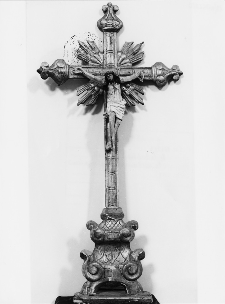 Il Cristo ha perizoma bianco. Il crocifisso e' dorato, la doratura e' scrostata nel piedistallo. Il crocifisso e' inserito nel piedistallo