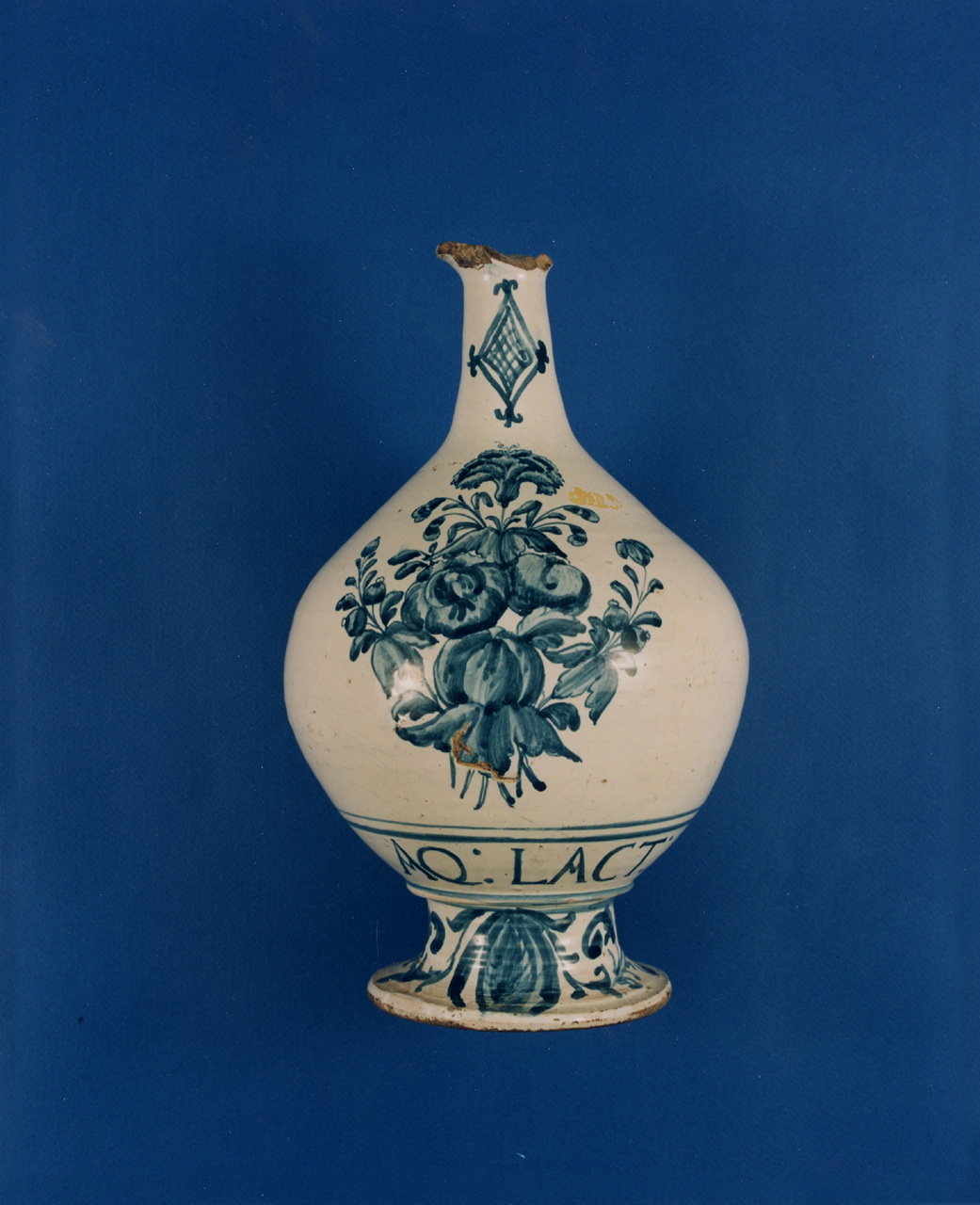 Bottiglia da farmacia con decoro fitomorfo con scritta.Colori:blu cobalto