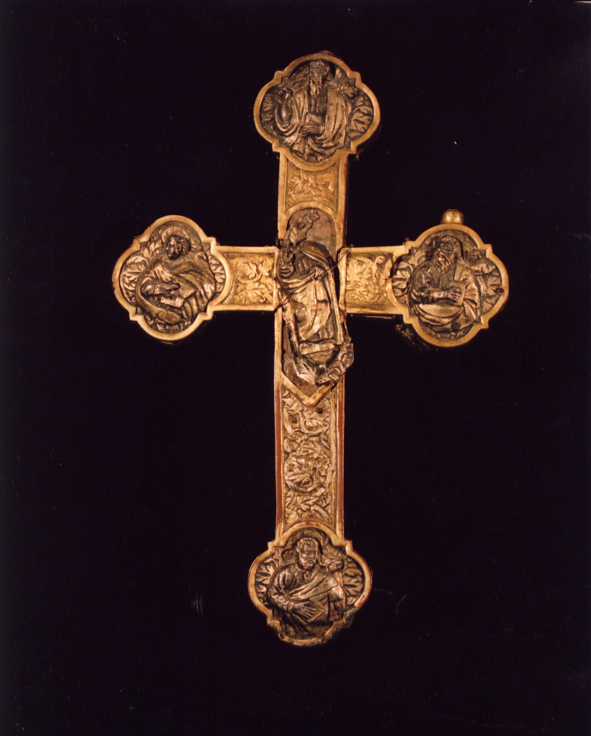 - NOTIZIE STORICO CRITICHE La croce è stata eseguita in ambito sulmonese dopo il 1484, come si evince dal bollo stampigliato sul metallo (cfr. Mattiocco E., 1997). Il manufatto ripete una tipologia di croce consueta in ambito sulmonese già dal Trecento e che nel corso dei secoli è andata modificandosi, per lo più negli ornati (arricchendosi di qualche sferula lungo i bordi) e nella resa plastica delle figure. Il bene si inserisce nell'ultima fase della produzione sulmonese, quando gli orafi persa ogni inventiva ritornarono ad usare gli stampi per modellare le figure, preferendo rappresentare quelle a mezzo busto secondo i modi della tradizione orafa aquilana. La croce di Goriano ne è un eloquente esempio (cfr. Mattiocco E., 1968)