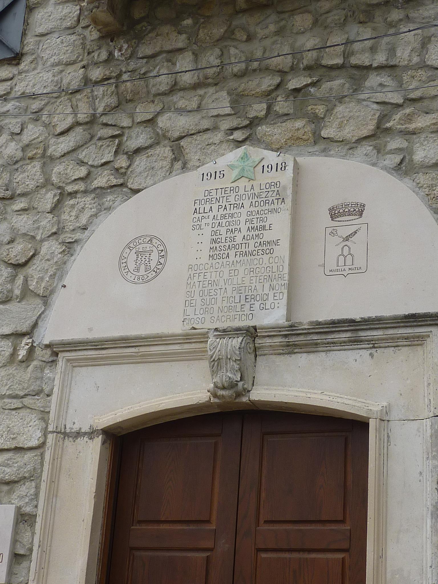 - ISCRIZIONI al centro della lapide - 1915 - 1918/ DETTERO LA LORO/ FIORENTE GIOVINEZZA/ ALLA PATRIA ADORATA/ CAP.LE ALBERICO GIOVANNINO/ SOL.TO D'ALOISIO PIETRO/ SOL.TO DEL PAPA AMABILE/ SOL.TO INGLESE ADAMO/ SOL.TO MASSAROTTI CARMINE/ SOL.TO MOSCA FRANCESCO/ ROCCACARAMANICO, CON/ AFFETTO ED ORGOGLIO/ MATERNI, VOLLE ETERNARE/ SU QUESTA PIETRA I NOMI/ DEI SUOI FIGLI EROICI ED/ IL LORO NOBILE EGLO:/ RIOSO SACRIFICIO - maiuscolo -