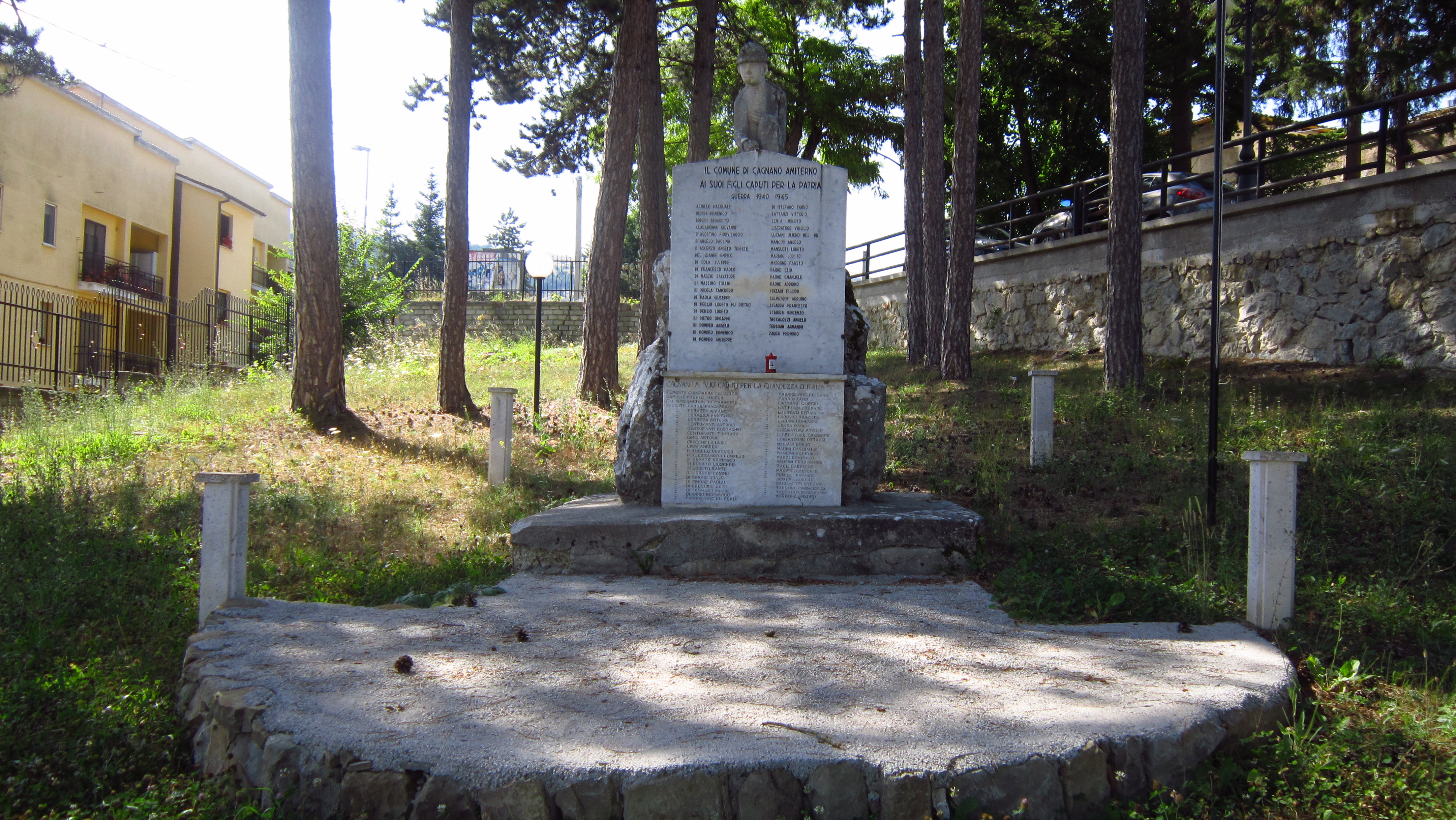 - ISCRIZIONI In basso - CAGNANO AI SUOI CADUTO PER LA GRANDEZZA D'ITALIA 1915 - 18/ TENENTE CIANFRINI FEDERICO/ CAP MAG FABRIZI ANGELO/ CAP MAG SARTORI RICCIARDETTO/ SOLDATO CAROSI PANGRAZIO/ CORAZZA ABRAMO/ CORAZZA VINCENZO/ CORAZZA ANTONIO/ CENTOFANTI ANTONIO/ CENTOFANTI EUSTACHIO/ CENTOFANTI TOMMASO/ CIRCI ANTONIO/ CRUCCHIOLA LUIGI/ CIMINI AMEDEO/ D'ANGELO DOMENICO/ D'ALESSANDRO POMPILIO/ DI DONATO DOMENICO/ DI DONATO GIUSEPPE/ DI LORETO SANTE/ DI LORETO COSIMO/ DI SIMONE GIULIO/ DI SIMONE PAOLO/ DI GREGORIO LUIGI/ DI TOMMASO SILVIO/ DI MARIO BERNARDO/ FABRIZI VINC. FU FERD./ FABRIZI VINC. FU CARM./ FABRIZI LUIGI/ LATTANZI GIORGIO/ LAURENZI BERNERDINO/ LODOVICI ROBERTO/ LUCIANI DOMENICO/ LENZA PAOLO/ LIBERATORE ATTILIO/ LIBERATORE GIUSEPPE/ LIBERATORE OTTAVIO/ MARIANI EMILIO/ MARINI PASQUALE/ MANCINI DOMENICO/ MASCI DOMENICO/ MANCINI FERDINANDO/ PACE GABRIELE/ PACIFICI GIUEPPE/ PERILLI FRANCO/ SCIARRA LORETO/ SACCHETTI ANTONIO/ TARQUINI FRANCESCO/ TACCALOZZI GIOVANNI/ MARRONE AMEDEO -