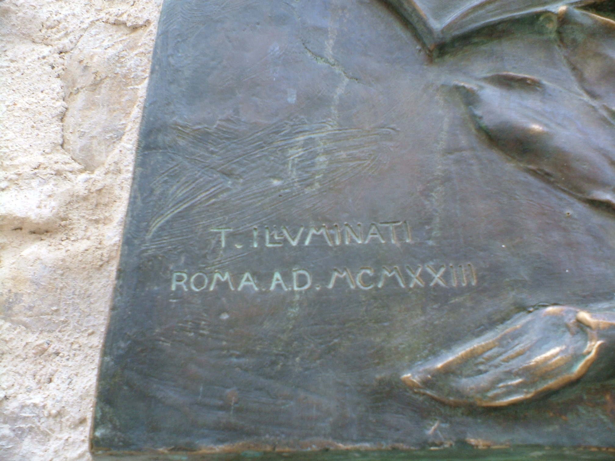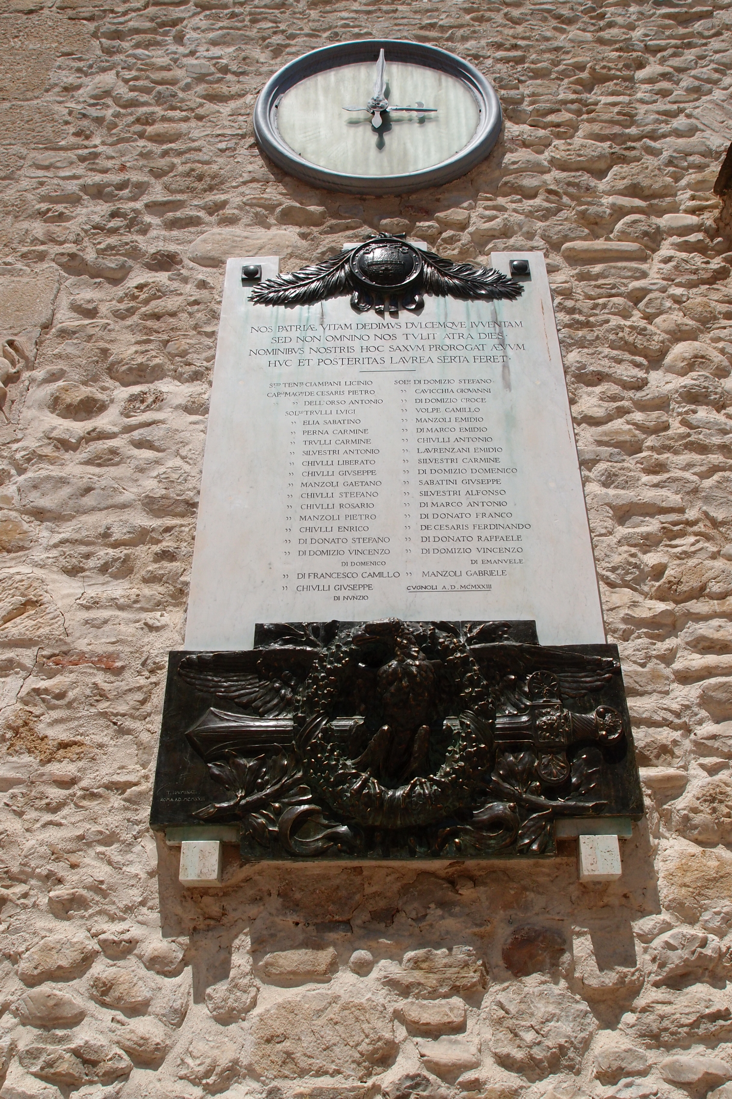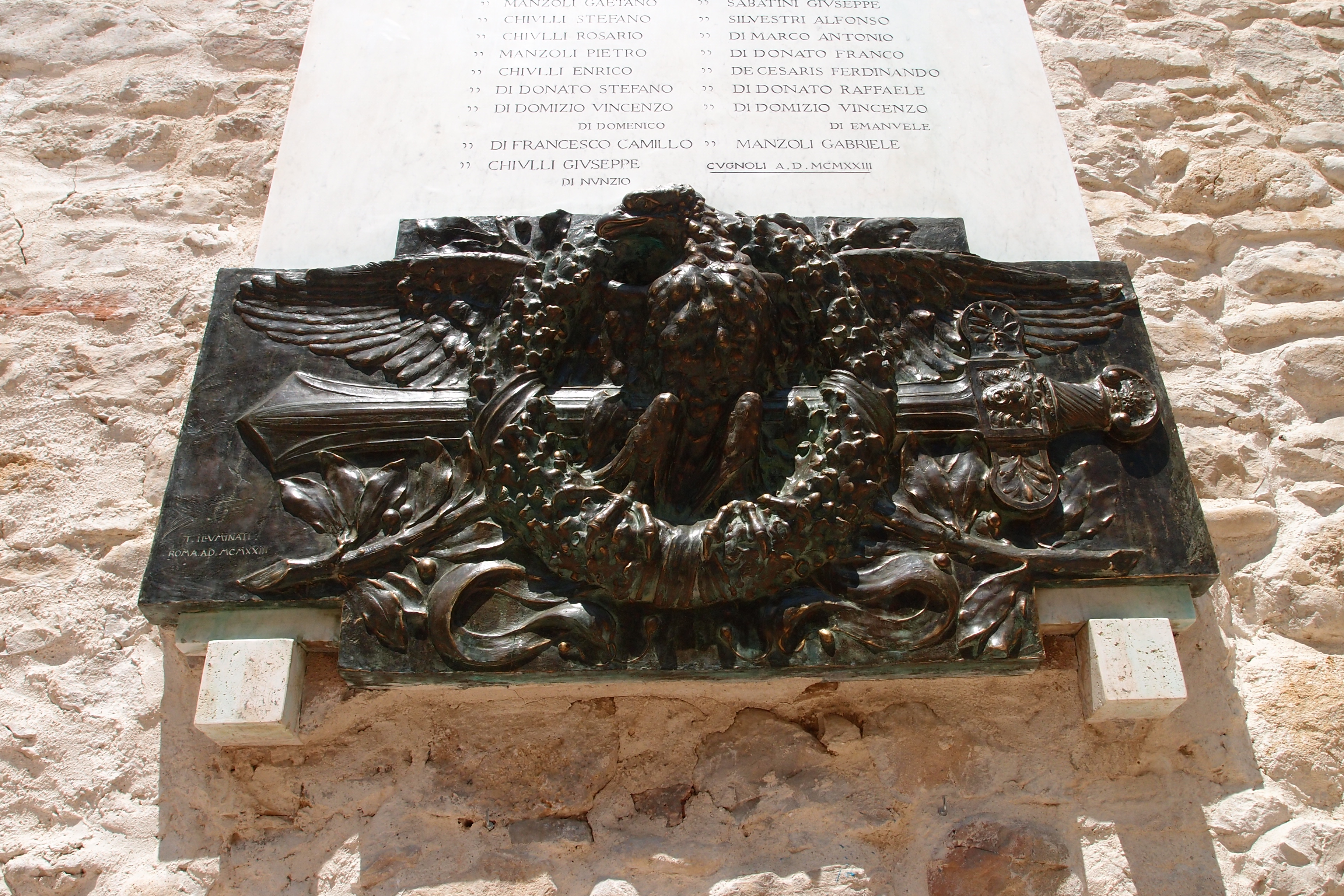 - NOTIZIE STORICO CRITICHE Alcune immagini storiche attestano la presenza, sulla lapide, di due fasci littori in bronzo, di cui oggi resta soltanto la traccia dei quattro fori stuccati, posti ai lati dell’elenco dei caduti. Autore dell’opera è Tommaso Illuminati, nato ad Atri ma attivo principalmente a Roma, dove vive e lavora quando realizza la lapide di Cugnoli. L’opera ripropone la predilezione, che caratterizzerà buona parte della produzione dell’artista, per l’impiego del bassorilievo e delle sue varianti. Il pannello in bronzo che decora la lapide, infatti, esprime tutte le potenzialità della materia impiegata, caratterizzandosi soprattutto per la cura artigianale del dettaglio e per il gusto pittorico nel trattamento delle superfici. Per le fonti si veda: Mario Rivosecchi, “Tommaso Illuminati, scultore”, Fratelli Palombi, Roma, 1973