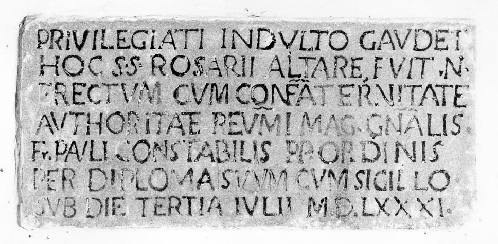 - ISCRIZIONI lapide - PRIVILEGIATI INDULTO GAUDET HOC SS. ROSARII ALTARE FUIT. N. FRECTUM CUM CONFATERNITATE AUTHORITAE REUMI MAG . GNALIS FR. PAULI CONSTABILIS PP. ORDINIS PER DIPLOMA SUUM CUM SIGILLO SUB DIE TERTIA IULII MDL XXXI - lettere capitali - a incisione -