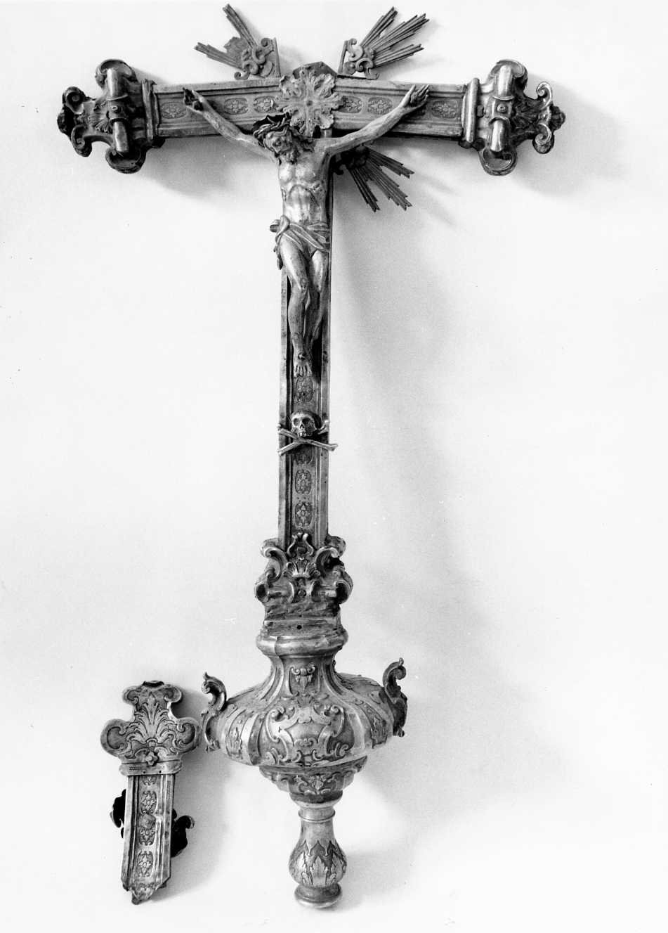 Nodo diviso da quattro nervature e decorato con cartelle mistilinee e due grandi ricci laterali. Sulla croce, dal fondo inciso a fiori racchiusi in un ovale, sono applicati il Cristo, il teschio ed il cartiglio. All'incrocio dei bracci con i terminali sagomati c'è la raggiera