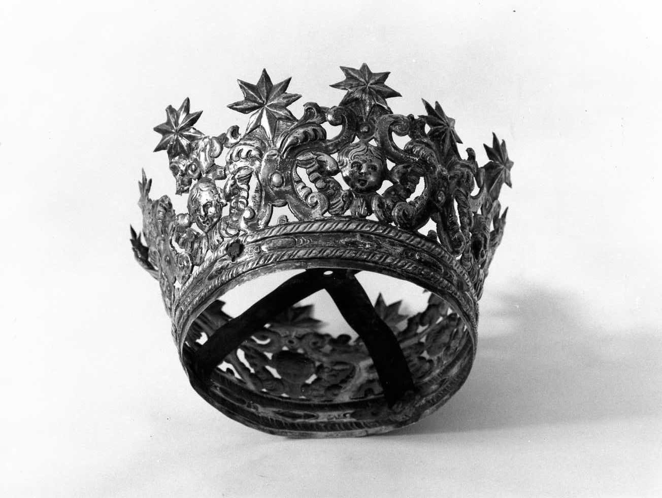 Sul cerchio della corona, decorato con un duplice motivo a cordoncino, si leva il fastigio con stelle ad otto punte e teste cherubiche tra volute e foglie d'acanto