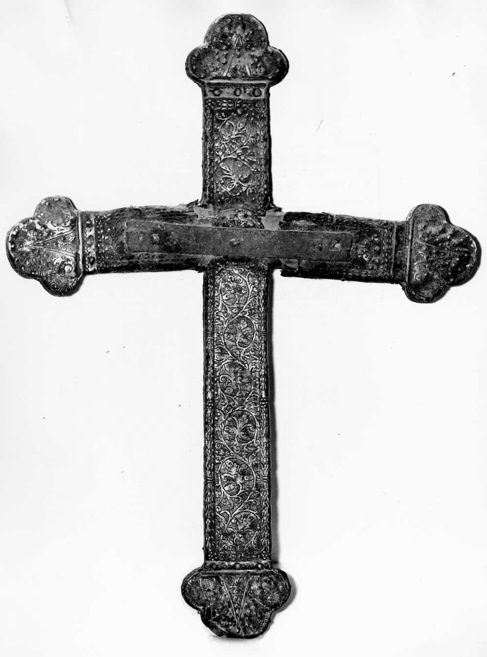Croce, priva del Cristo Crocefisso, con estremità trilobate raccordate ai bracci mediante piccoli chiodi. Sul recto e sul verso presenta girali di fiori risaltanti su uno sfondo a fitte maglie incrociate irregolari. I bordi dei bracci sono ornati con fregio continuo a fasci di foglie d'alloro. I bordi trilobati sono invece ornati con fregio a ovoli entro cerchi
