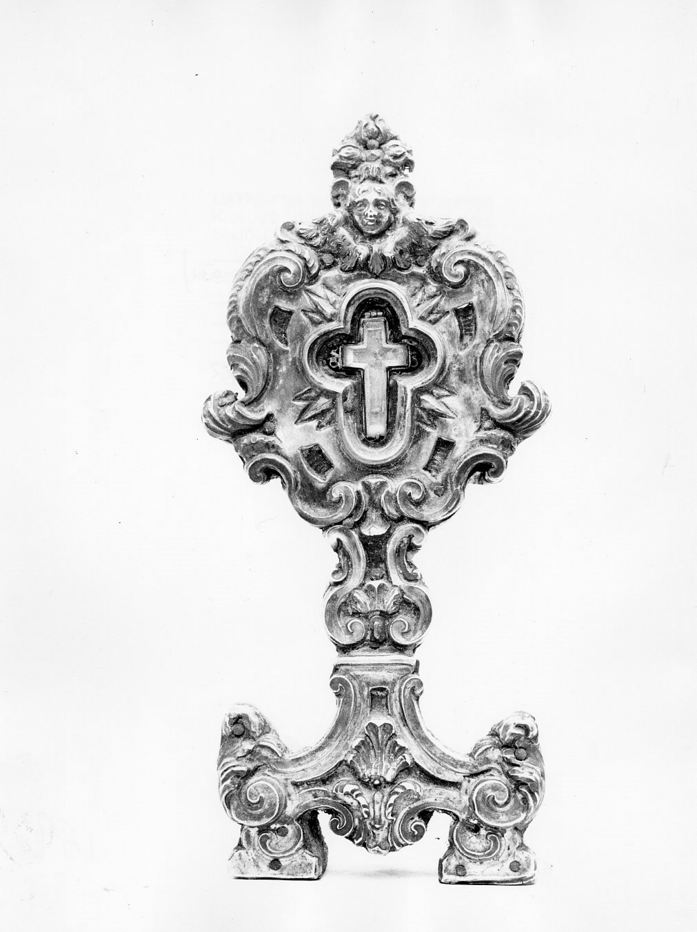 Il connettersi in simmetria di volute e di elementi vegetali stilizzati definisce la conformazione della base (con due piedini), del breve fusto e della cartella che include la sede della reliquia, sagomata a croce lobata; il terminale superiore è costituito da un cherubino sormontato da una piccola croce