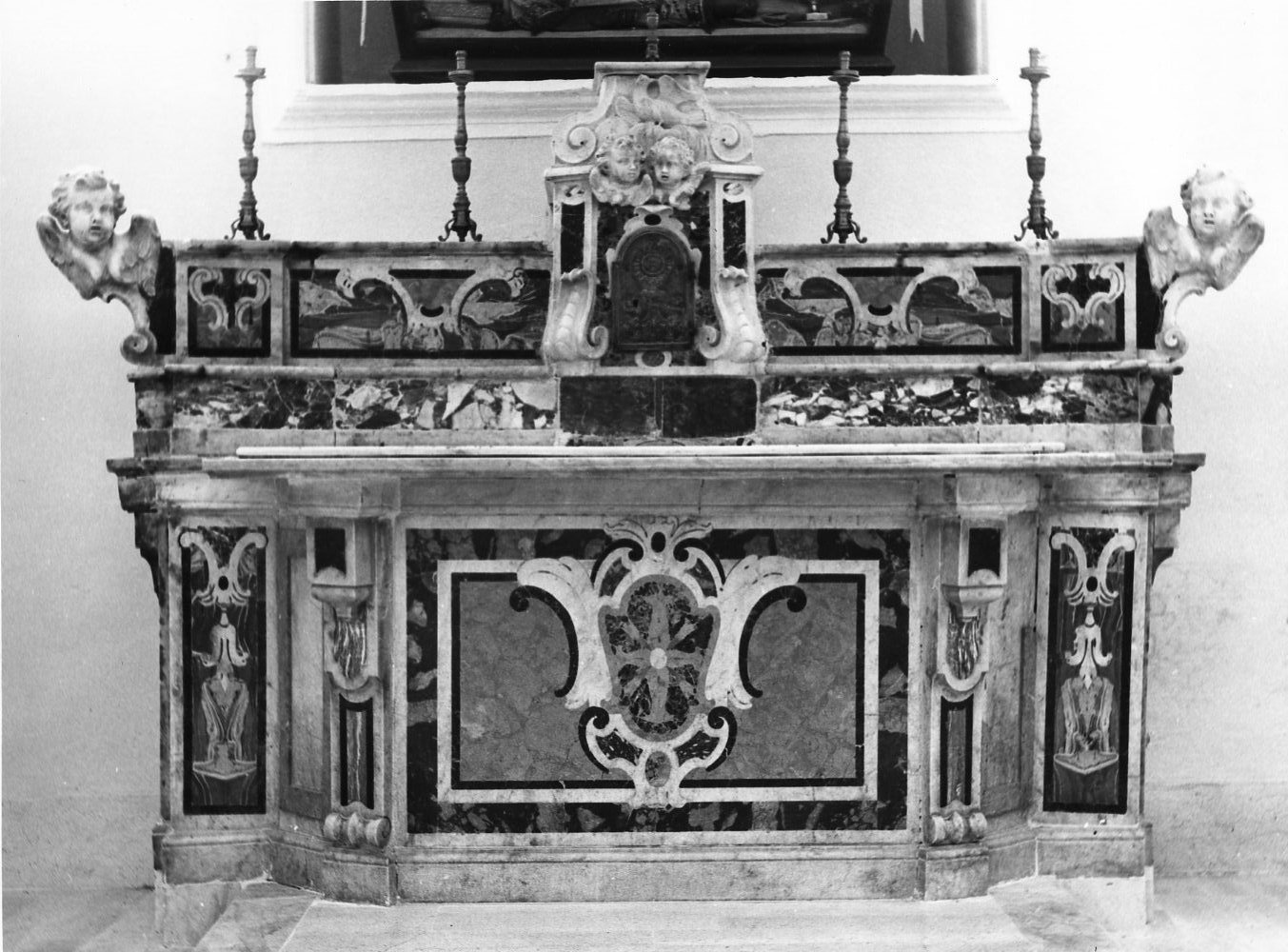 La mensa si imposta su due lesene angolari con peduccio e su un avancorpo che presenta un riquadro decorato da uno stemma con croce al centro. L'alzato a due gradini, decorati da intarsi a volute, si imposta su due pilastrini laterali che si presentano ornati con volute e palmette; al centro si innesta un ciborio, ad andamento poligonale, con volute e fastigio decorato con protomi di angeli e Colomba dello Spirito Santo; alle estremità, due aggettanti protomi alate di angeli