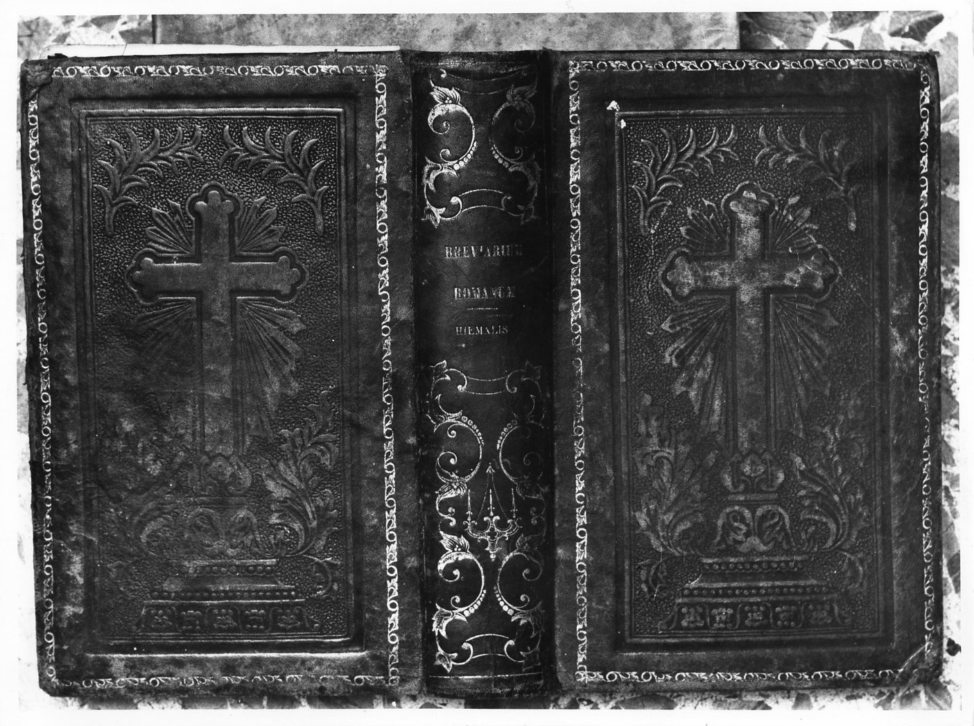Nella rilegatura in pelle marrone, del Breviarium Romanum, sono incisi dei motivi a volute e palmette, al centro dei quali sono due croci; tutt'intorno e nel frontespizio motivi a volute impressi in oro
