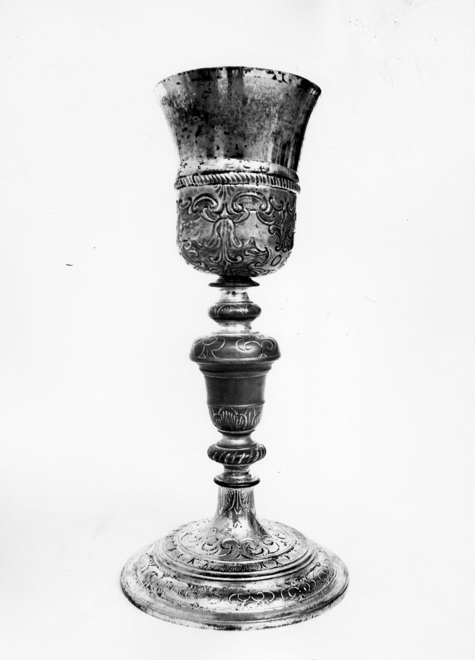 Sulla base di ottone ad andamento circolare, modanata, con motivi a volute si imposta lo stelo a nodi sagomati con incisioni a palmette e volute; la coppa d'argento, è sbalzata a palmette e volute nella parte inferiore