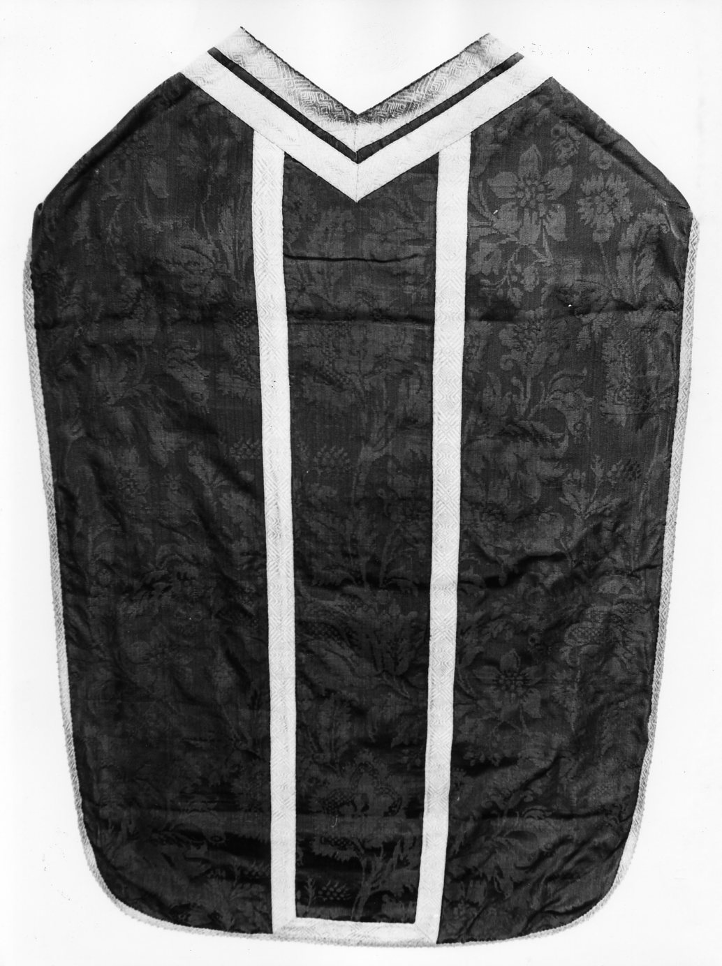 La pianeta è in tessuto antico damascato violaceo, con fiori, foglie e racemi; galloni giallo-oro
