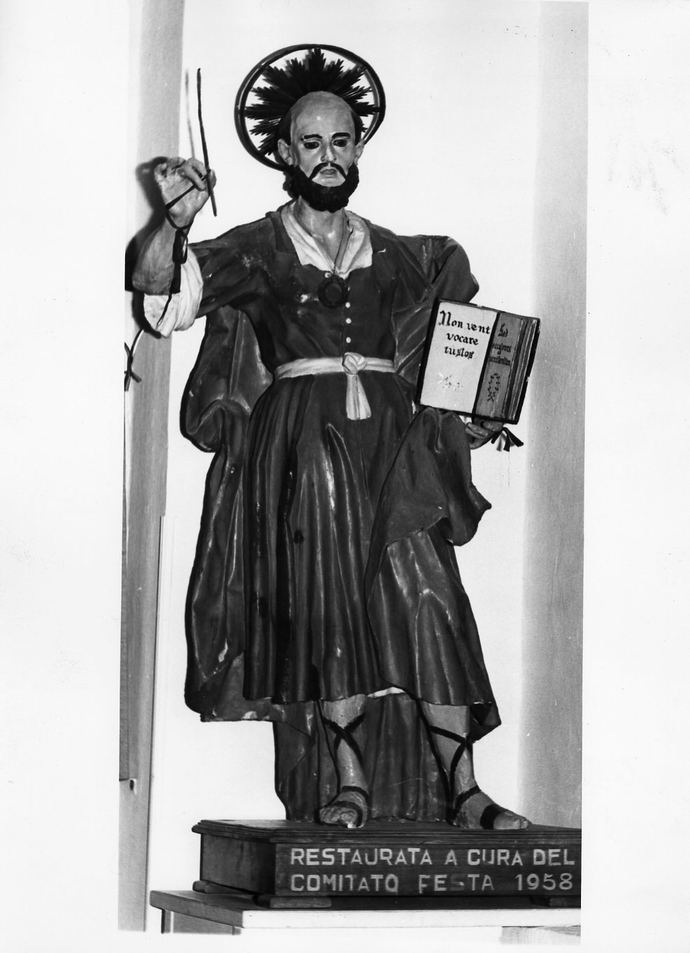 La statua raffigura San Matteo, con il capo calvo aureolato, il volto ornato dalla barba, che indossa una veste marrone che gli lascia scoperti i calzari, mentre un ampio manto rosso gli scende dalle spalle; tiene con la destra un calamo e con la sinistra un libro aperto con un'iscrizione
