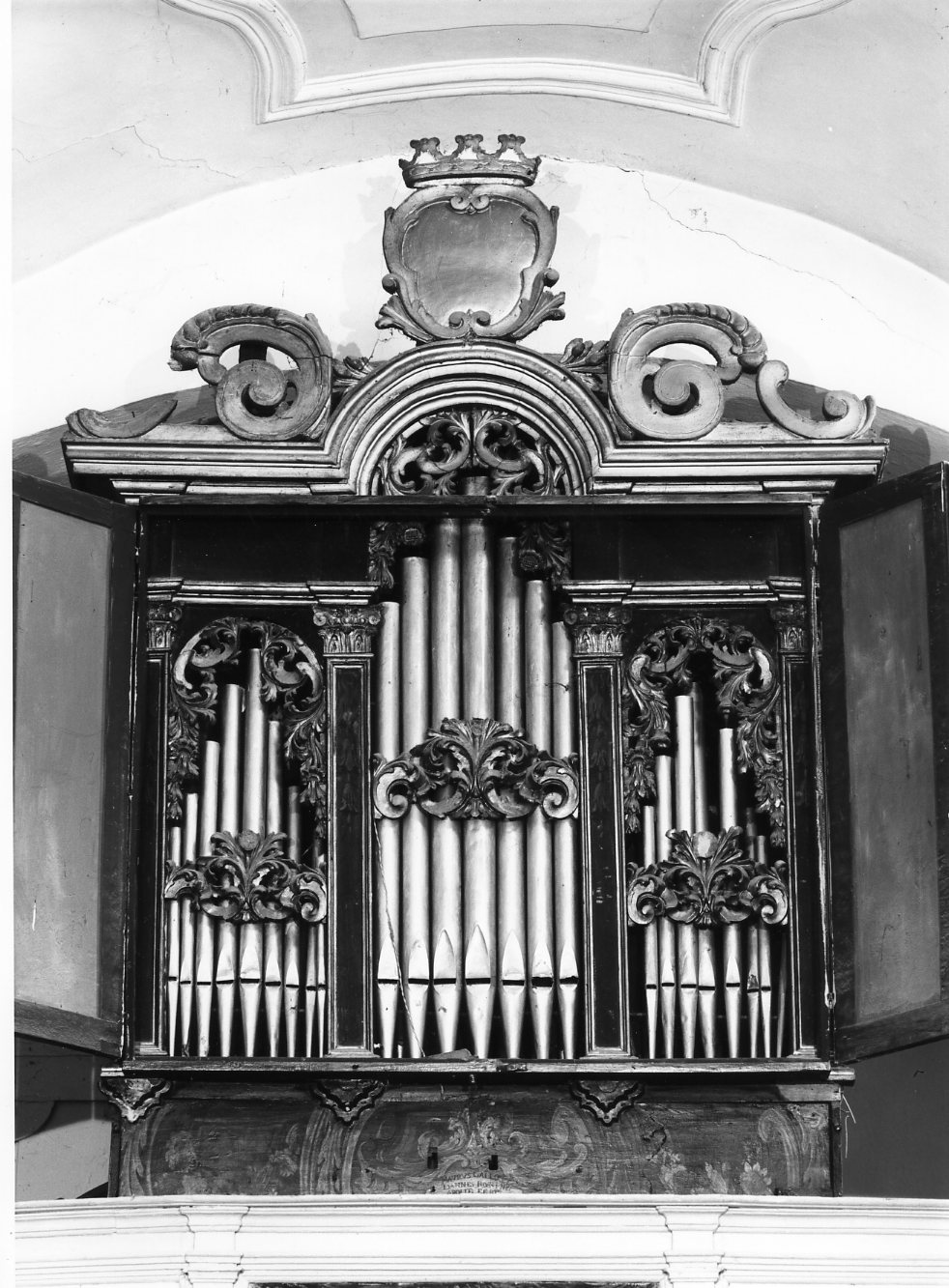 Mostra decorata ad olio con volute dorate, ai lati paraste, alla sommità uno specchio sovrastato da diadema: Prospetto piatto chiuso da doppie portelle, trattate con tinta marrone