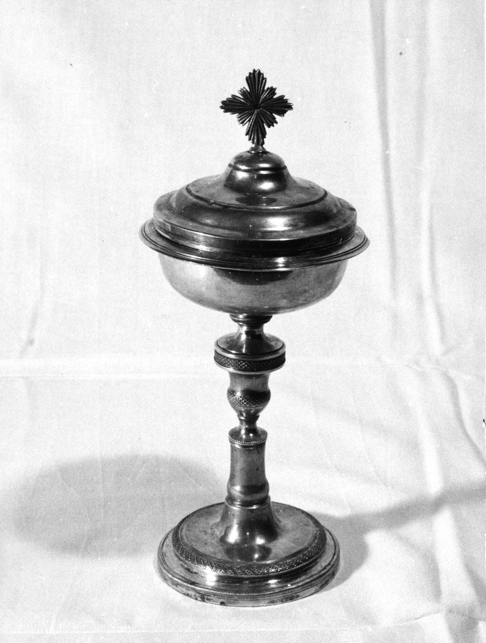 - NOTIZIE STORICO CRITICHE Il bollo impresso sulla pisside è quello in uso nelle province napoletane tra il 1839 e il 1872 (cfr. e. C. Catello, 1973). Tale cronologia trova riscontri nei sobri motivi ornamentali dell'opera che riveste un relativo interesse artistico
