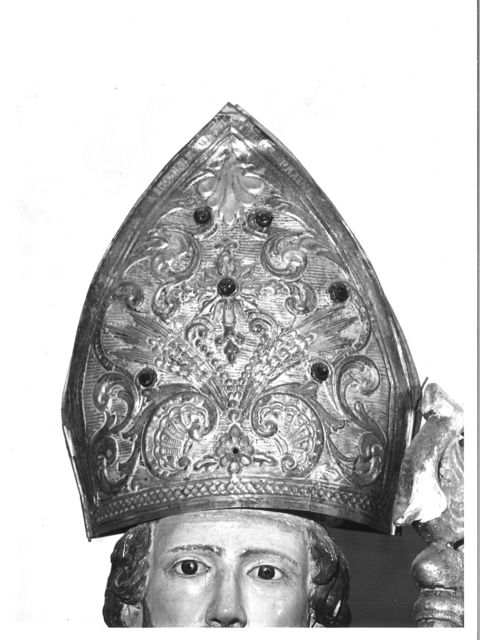 Mitria episcopale di statua, sul capo della statua raffigurante San Donato, decorata a sbalzo con fiori, conchiglie, spighe, cespi d'acanto