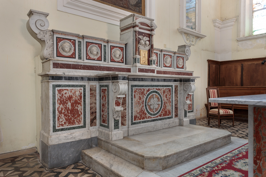 - NOTIZIE STORICO CRITICHE L'altare maggiore marmoreo denuncia reminiscenze stilistiche barocche ormai irrigidite nello schematismo ottocentesco, come si può constatare nel l'uso della policromia, nell'intaglio delle figure e nella interpretazione delle volute. Si può ipotizzare che si tratti di un opera eseguita in ambiente locale da un artigiano che si è ispirato ai più prestigiosi modelli barocchi