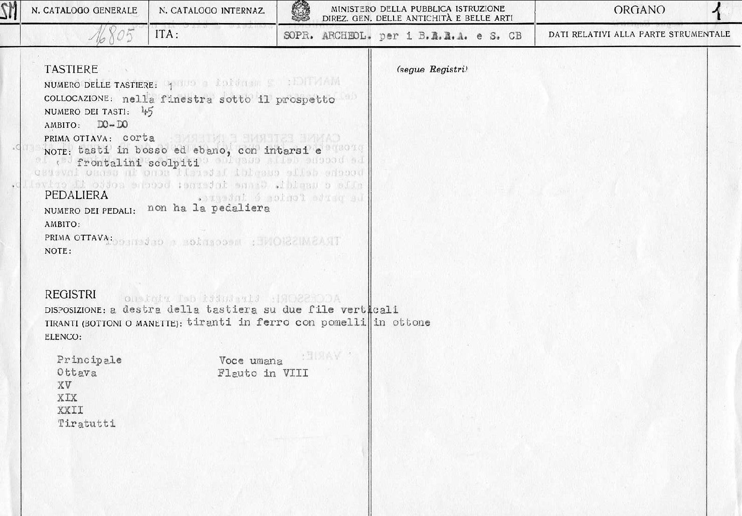 Canne di facciata in stagno, formanti tre cuspidi. La cuspide centrale ha le canne con le bocche allineate e labbro superiore a mitria, le cuspidi laterali hanno bocche in senso inverso alle cuspidi. Tastiera scavezza in bosso ed ebano con lunette frontali. Non ha pedaliera