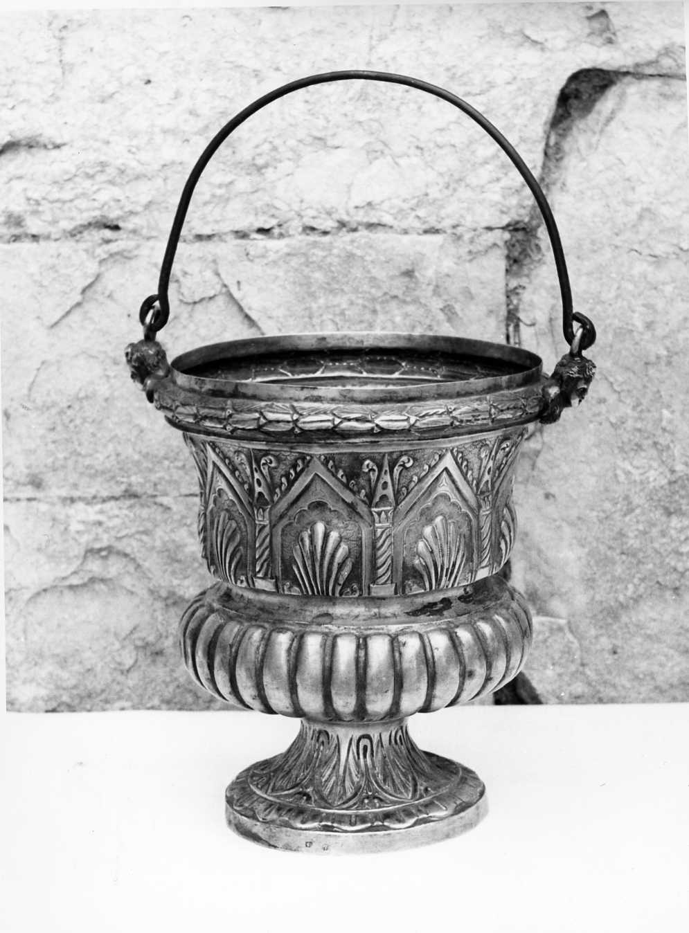 La base circolare con gradino liscio e piede percorso da foglie nervate è sormontato dalla coppa con pancia baccellata e collo pecorso da un motivo a edicoletta con gagle gattonati, intervallate da pilastrino tortili con pinnacolo cuspide. Sull'orlo con serto continuo i foglie sono applicate due testine fuse per l'applicazione del manico