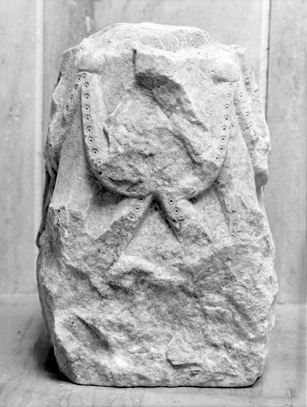 Il blocco di pietra di forma trapezoidale è scolpito su tre facce con motivi di festoni con minuti cerchietti e fori di trapano. L'altra faccia è liscia e curva
