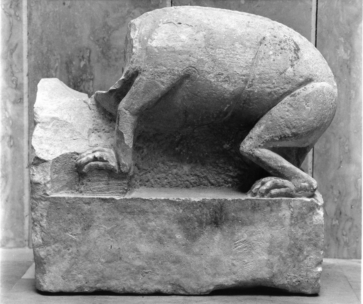 La scultura mutila della testa rappresenta un animale con zampe pittosto sviluppate e artigli. Tra quelle anteriori il blocco di pietra è appena sbozzato. La pietra risulta sfaldata in superficie
